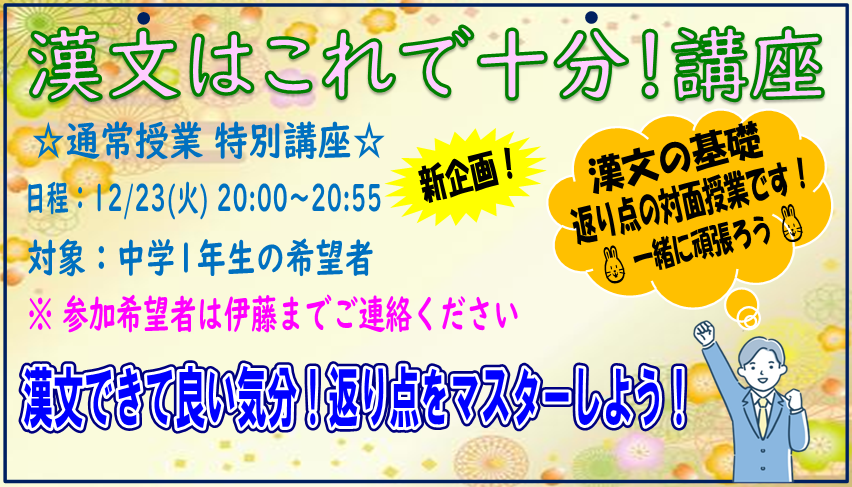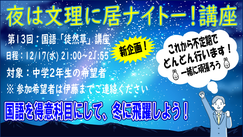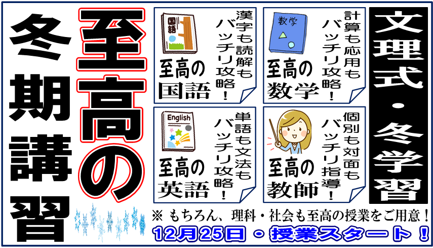 今日、私は甲府南校に出社しております。甲府でも夕方になると次第に寒さが増してきますが、この後私は小学生英検クラス、中学生の英語授業で熱く指導させていただきます。その甲府地区では明後日から2日間にわたって中3生対象の特訓授業が行われる予定で、受験に向けての合同特訓授業も山梨県ではここで最終となります。12月も半ばに入り、各小中学校では間もなく終業式も迎えますが、貴重な冬休みの期間に、文理学院での冬期講習の受講をお勧めいたします。お申し込みはまだまだ間に合います。