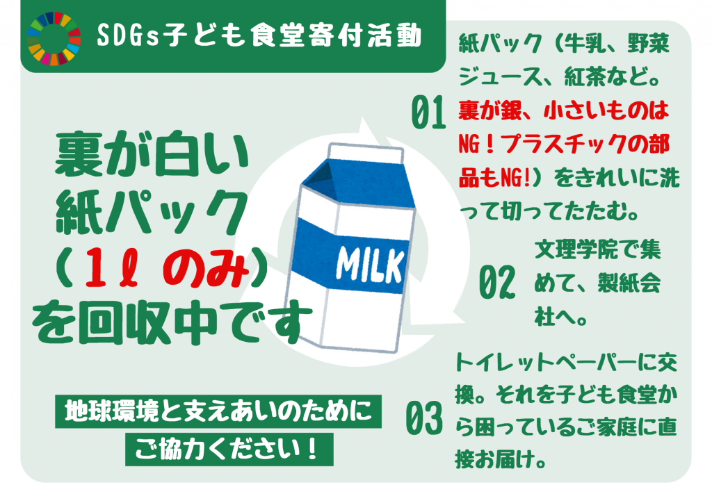 SDGs活動の一環として、牛乳パック・紙パックを回収しています!