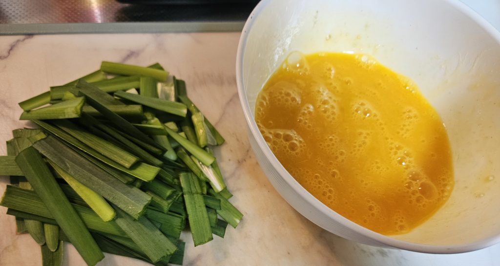 ニラは根元の部分は細かめに切り、卵にはニンニク岩塩・味の素・コショウを入れて溶きます。