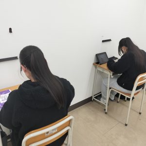 左から清水桜ヶ丘高3年のFさんと清水桜ヶ丘高1年のFさんです。お二人は姉妹です。お姉さんは来月の推薦試験に向けて面接練習を今週からスタートしました。今日も先ほどまでラウンジで面接練習を行いました。お二人並んで勉強に集中している姿を見ると、こちらも何だか微笑ましい気持ちになります。