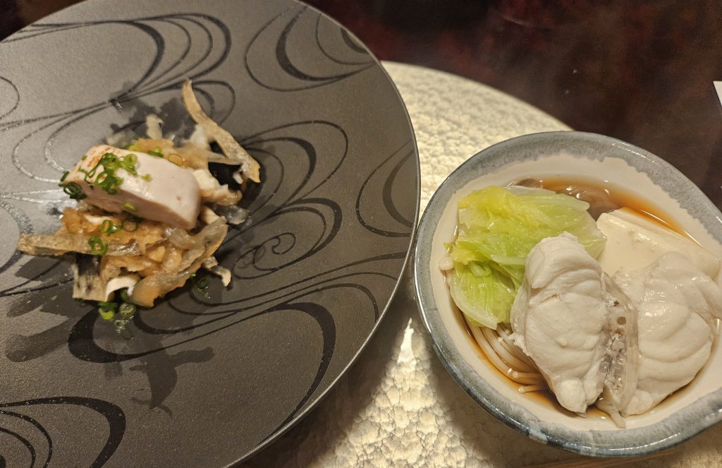 ちなみに左側のお皿は、フグ鍋を除くコース料理の一品目・フグ皮ポン酢です^^