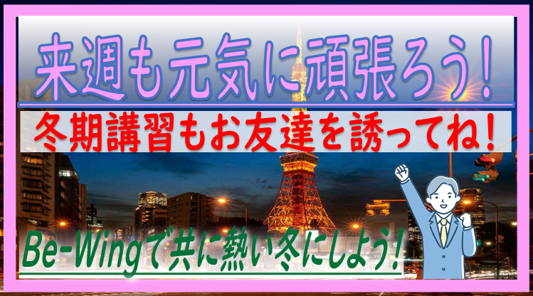 ♪ いやいやいやいやいや、長かった、今回も長かった。吉高さんと富士学さんの第3回定期試験、終了をもって都留本部校・高等部の定期試験対策期間もひと段落です。みなの衆、おつかれさまです。ちょっと☕ひと息🍩入れましょうもつかの間、もう12月も中盤、今年のまとめの時期です。1年を振り返って、自分の「できた!/できへんかった」をあぶりだしましょう。そして、見つかった学習の課題は、12/23(月)からのBe-Wing冬期講習(前半戦)で解消していきましょう。ひとりじゃ盛り上がらないって人は、どうせ、勉強するんなら身近なお友だち、内心ライバルだと思っているヤツ、部活が一緒の子を誘って、みんなで勉強していきましょう。
