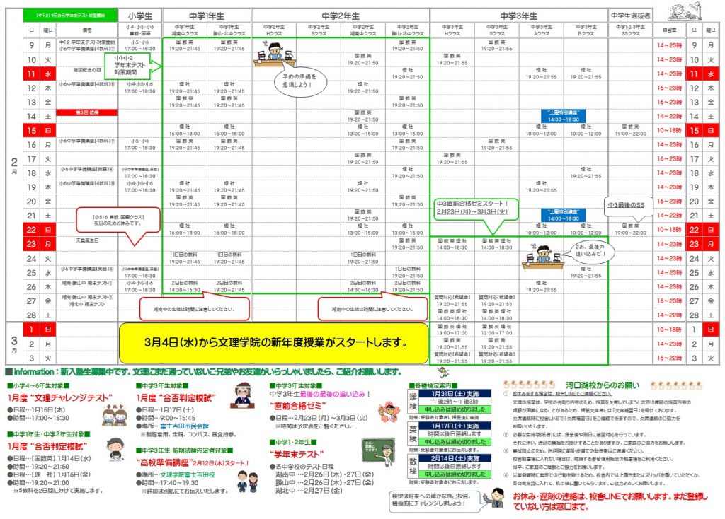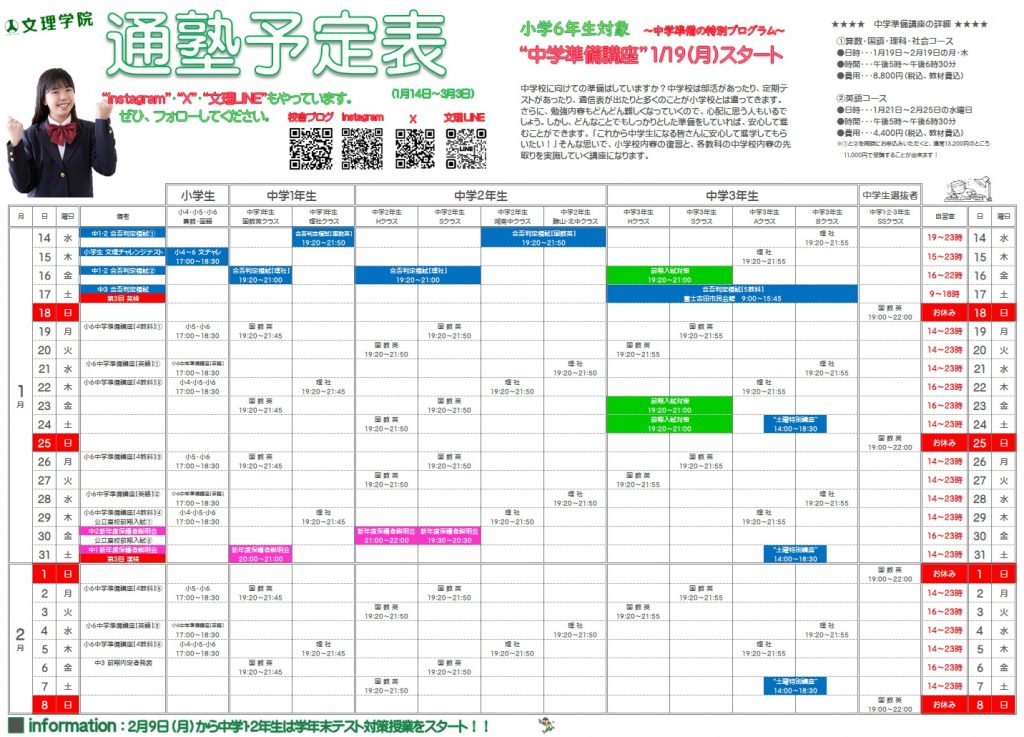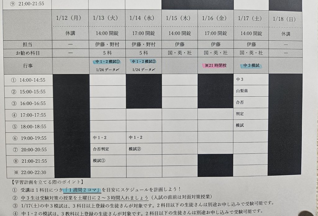 となっています。中学生は冬期講習が終わったばかりなので授業がありません。