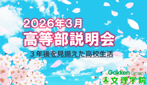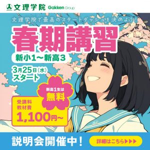 次回の説明会は3月14日(土)午後6:00より(事前予約が必要です)※説明会では文理学院月見校の紹介、塾生の成績状況、授業形態・テスト対策、年間スケジュール(模擬試験など)、入学時費用・月謝・年間学費などについて詳しくご説明いたします。 月見校電話番号:054-340-6755