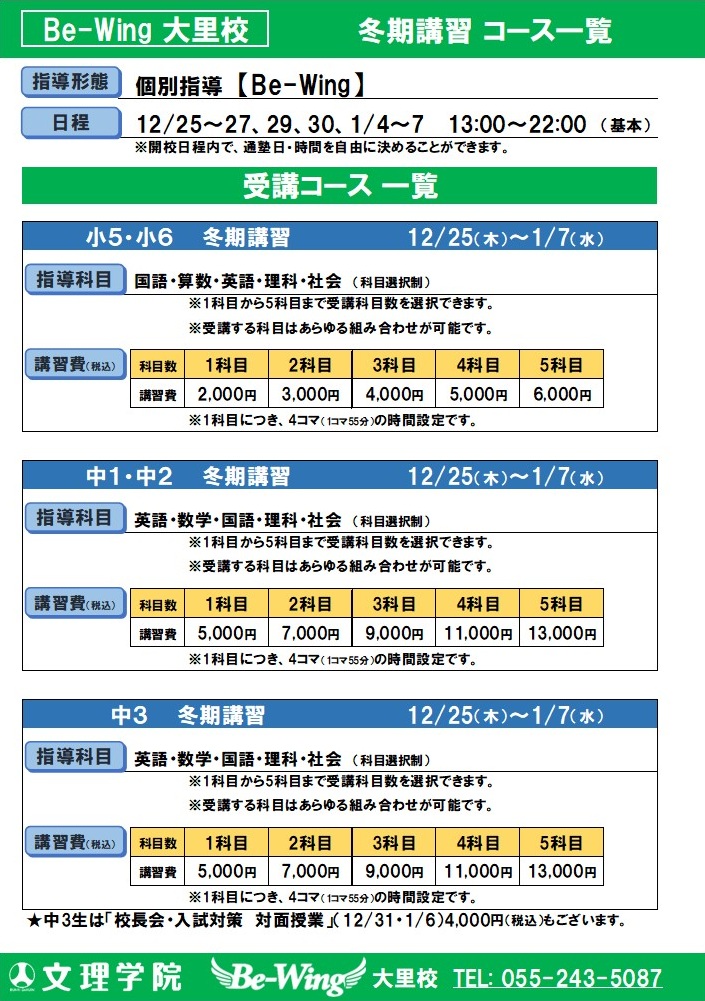 ★☆【2025年度 大里校 コース・費用一覧】☆★
