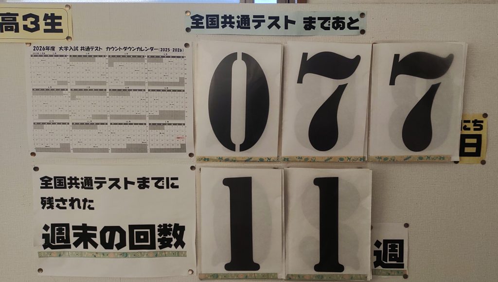 いよいよ11月です。共通テストまで残り77日。高校3年生はラストスパート。悔いが残らぬよう全力で取り組みましょう。共テまであと1年となる高校2年生は、秋季講座で共テ形式の問題を解きました。英語のリーディングと数学ⅠAに挑戦してもらいましたが、どちらの科目も時間がないことに驚いたと思います。あと1年で志望校のボーダーに届くよう指導していきます。豊田校舎と合同のランキングも作成しますよ。
