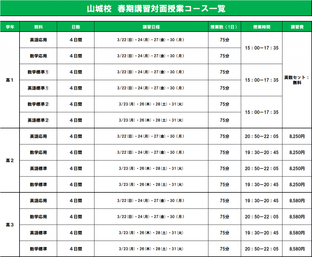 ここ、山城校舎では、新高校1年生を対象にした春期講習が3月22日よりスタートします!