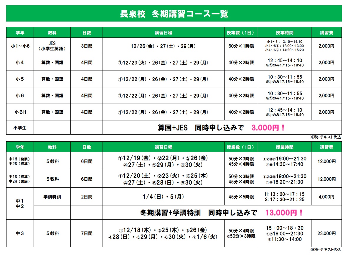 なお、高等部での冬期講習は、「長泉なめり校」で行います。長泉校同様に、自習室の開放や、個別の補習対応も無料で行っております。