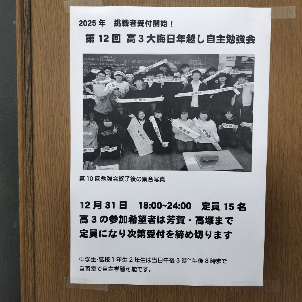 少し早いですが、第12回大晦日高3年越し自主勉強会の告知を各教室に掲示させていただきました。