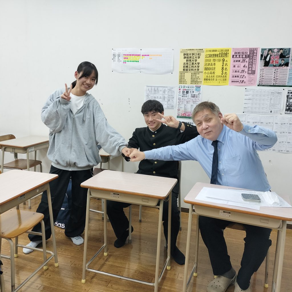 そして授業前、沼津東高3年S君の最終面接練習を行いました。面接練習終了後、同じく面接練習を行っている御殿場南高3年Tさんにも入ってもらって出陣式を行いました。
