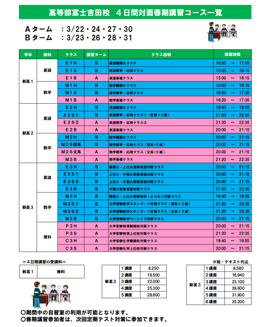 ▲新年度生募集中!文理学院では3月から新年度授業が始まります。もちろん新学年の授業を先取りで行っていきますので、4月からの学校の授業も安心して受けることができます!小学5~中学1年生は教科を選択しての受講が可能です。他の習い事やご家庭のご都合に合わせて通いやすくなっております。詳しくは上のバナーをご確認いただきますか、校舎(0555-22-8100)までご連絡ください。