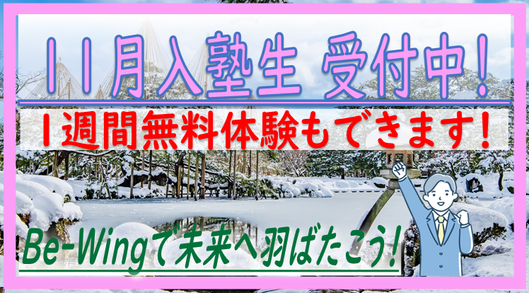 さて、Be-Wing東桂校では、今週も体験授業、個別面談のご予約をいただいております。おかげさまで、実際にBe-Wingの学習システムを使った授業体験会、東桂校説明会に関し、多くのお客様にご好評をいただいております。冬期講習のお申し込みを受付しておりますが、通常授業の新規のご入塾も承っております。お気軽にお問い合わせください。お待ちしております。