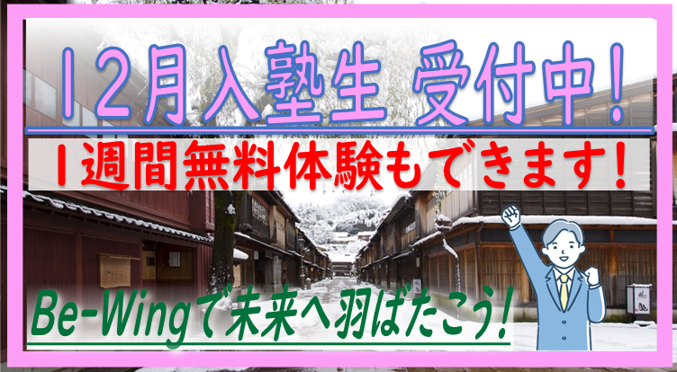 ▲冬期講習生募集中!冬休みを利用して二学期の復習&三学期の予習をしませんか?中学3年生は来る高校入試に備え、さまざまなニーズに即した講座をご用意しております。通常5教科に加え、前期入試や私立高校受験を受ける生徒のための「前期入試必勝プログラム」、吉田高校理数科を受験する生徒のための「吉理合格特別講座」がございます。セットでの受講も単品での受講も可能です。その他詳細は校舎(0555-22-8100)までお問い合わせください。