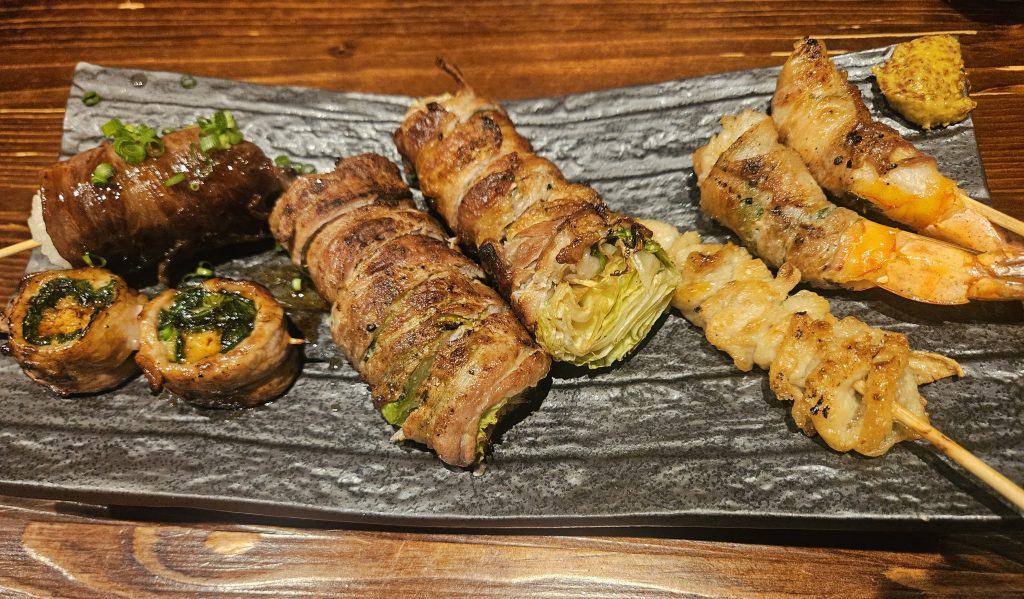 左から、和牛めし巻き・すき焼き串(おかわり)・レタス巻き・皮・えび(o^^o)