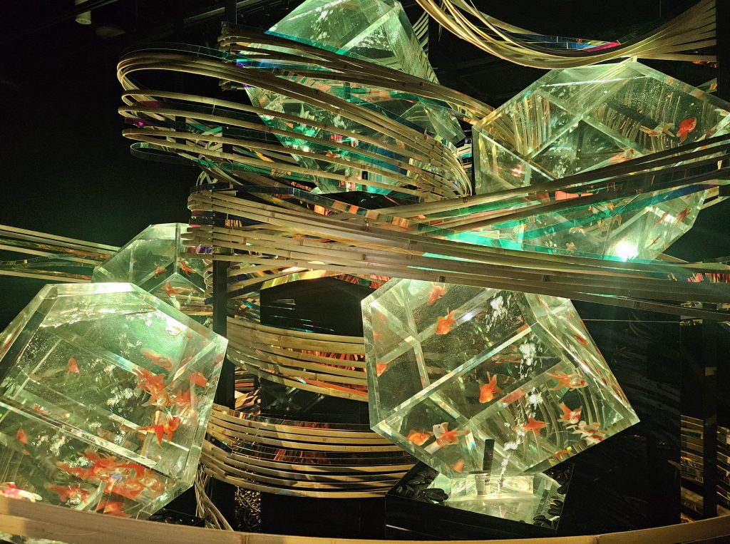日本庭園から水・花・樹木などを削ぎ落とし、岩や石のみで構成された「石庭」を、金魚が泳ぐ水の塊で表現した作品だそうです。