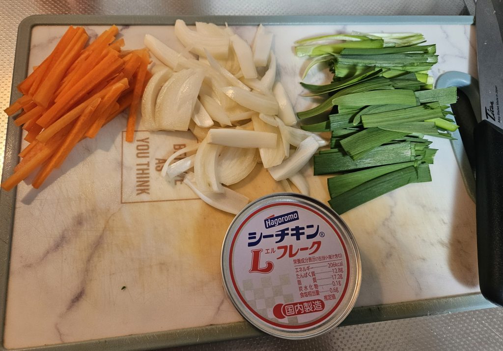 本日使う食材は、にんじん・たまねぎ・ニラ・シーチキン缶です^^