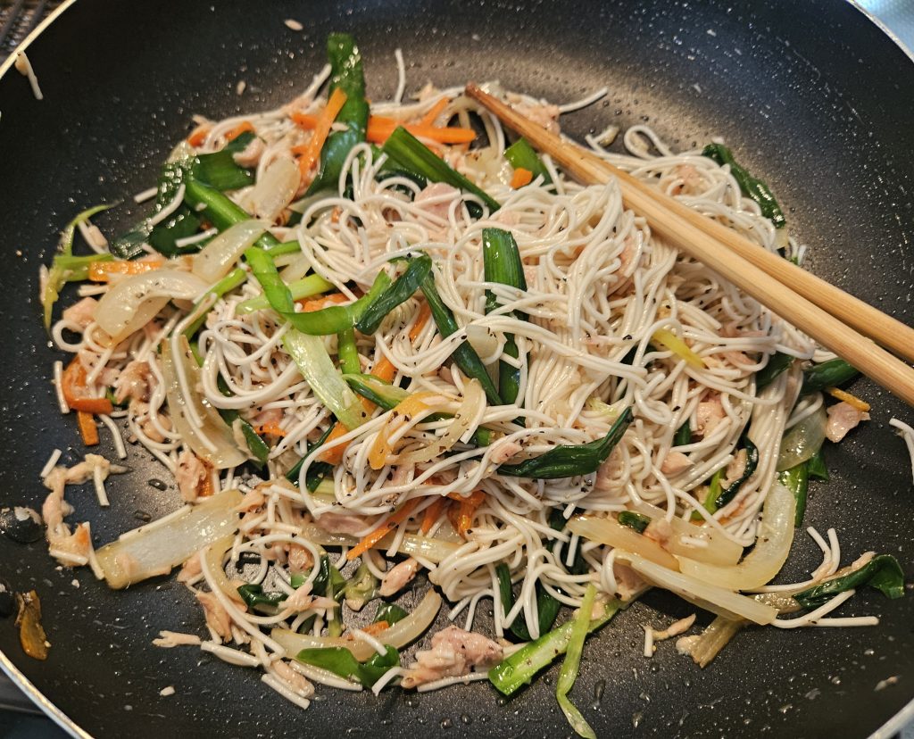 その後は、そうめんを先程の野菜のフライパンに投入します^^