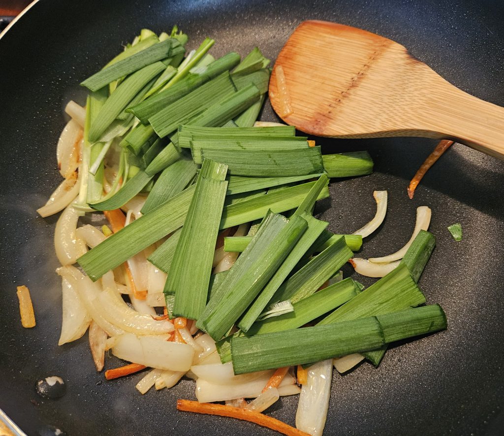 にんじんとたまねぎに火が通ったら、「火を止めて」ニラを投入です(o^^o)