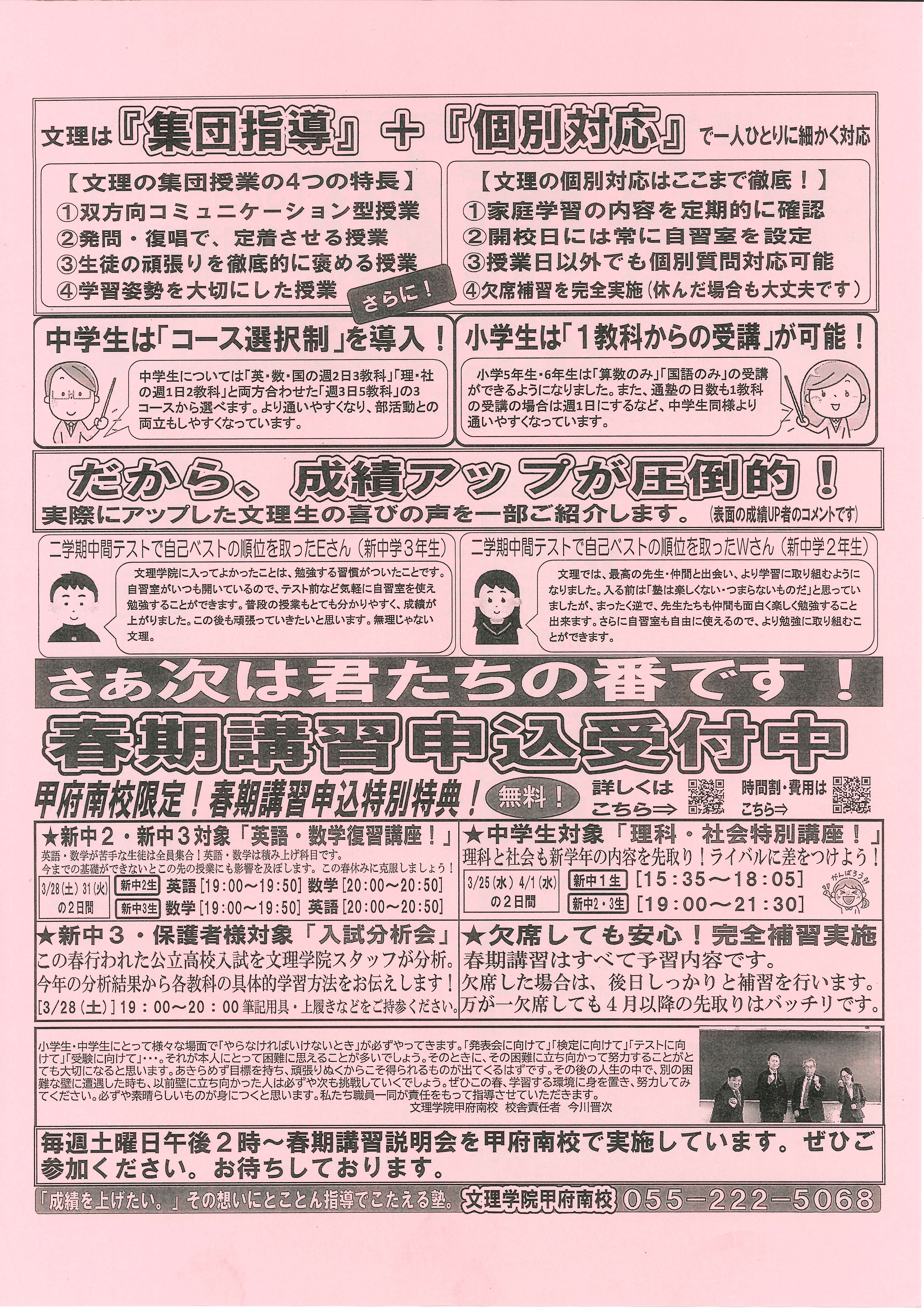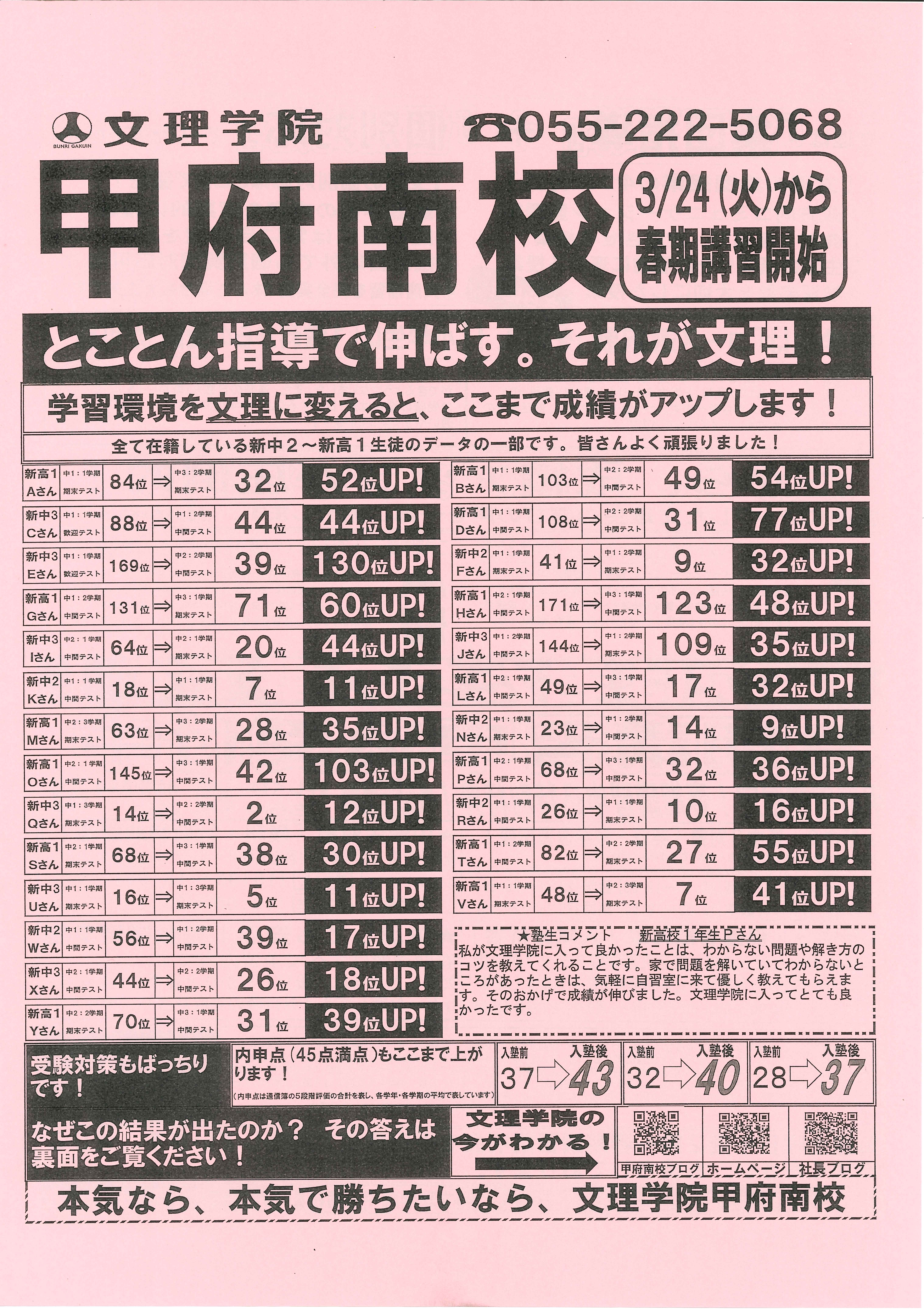 中学3年生の皆さん、高校入試お疲れさまでした。後期入試を受験した生徒は合格発表を待っている状況なので、不安な毎日を過ごしているのではないかと思います。しかし、4月7日(火)だと思いますが、山梨県内の公立高校の入学式が行われますので、1ヶ月後には実際に高校生活がスタートします。