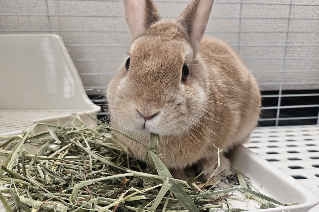 ウサギの歯は一生伸び続けるため、硬くて繊維質の多い牧草を食べることで削られ、適切な長さに保たれているそうです。