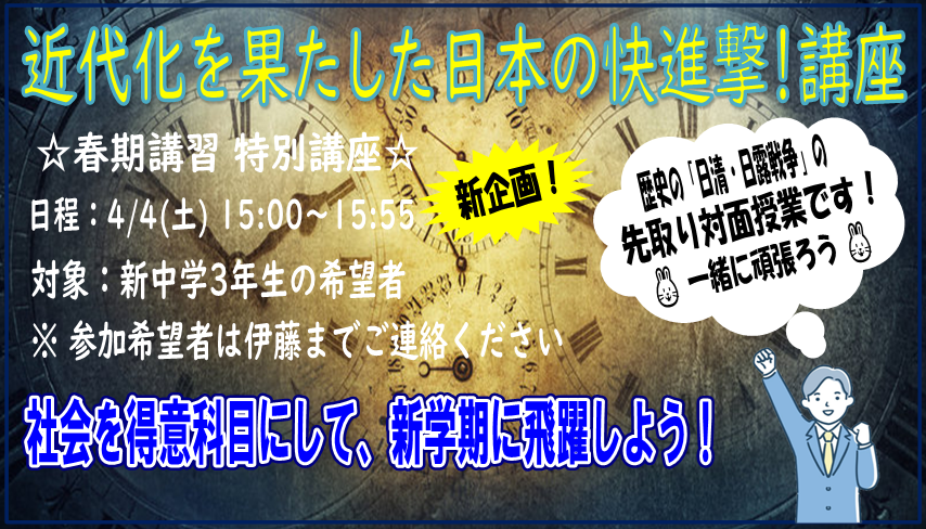 🌸新中3生対象「近代化を果たした日本の快進撃! 講座」実施のお知らせ🌸 ※新企画!
