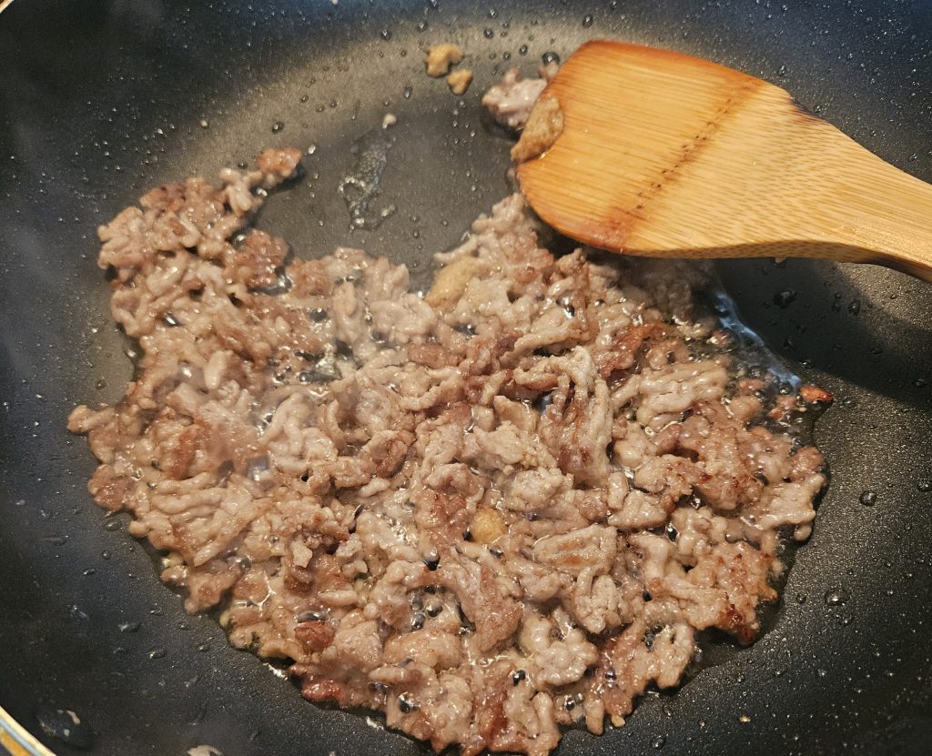 先程のひき肉のフライパンに水200CCを入れます(o^^o)