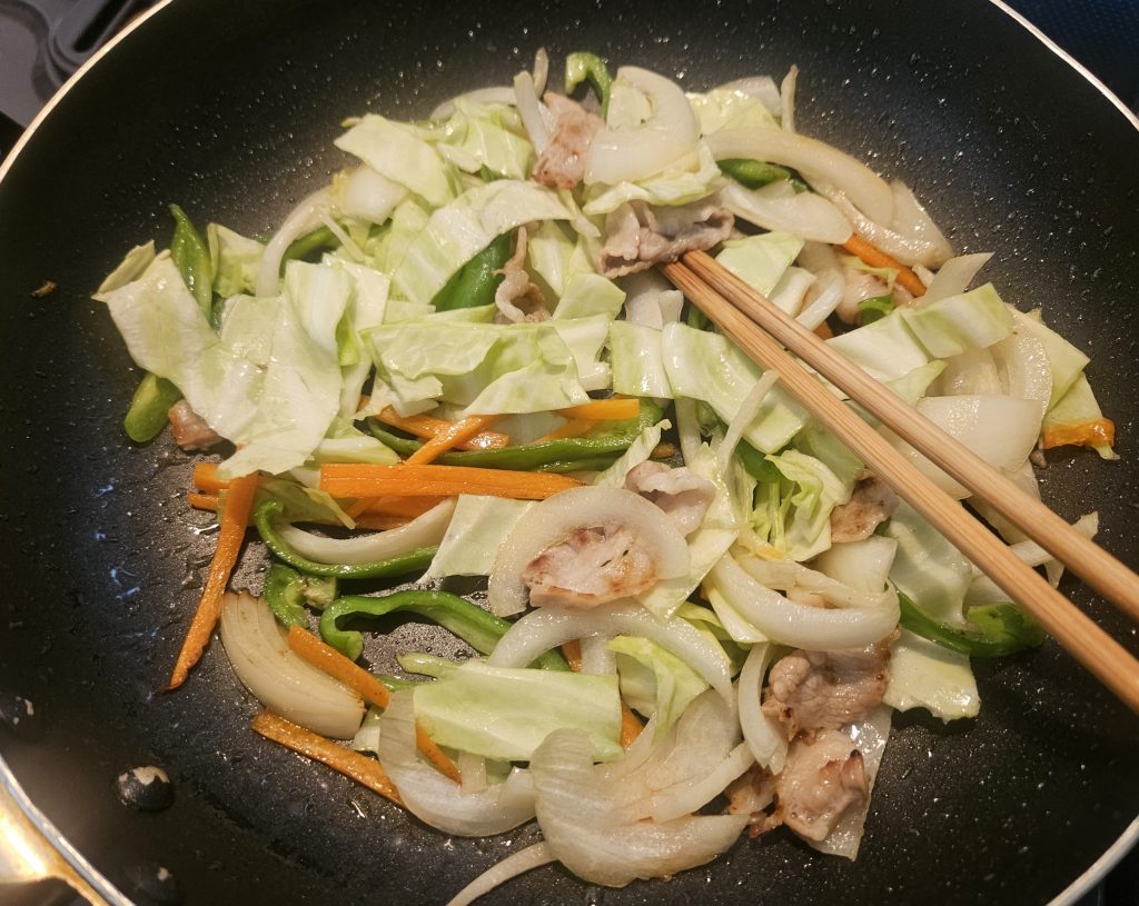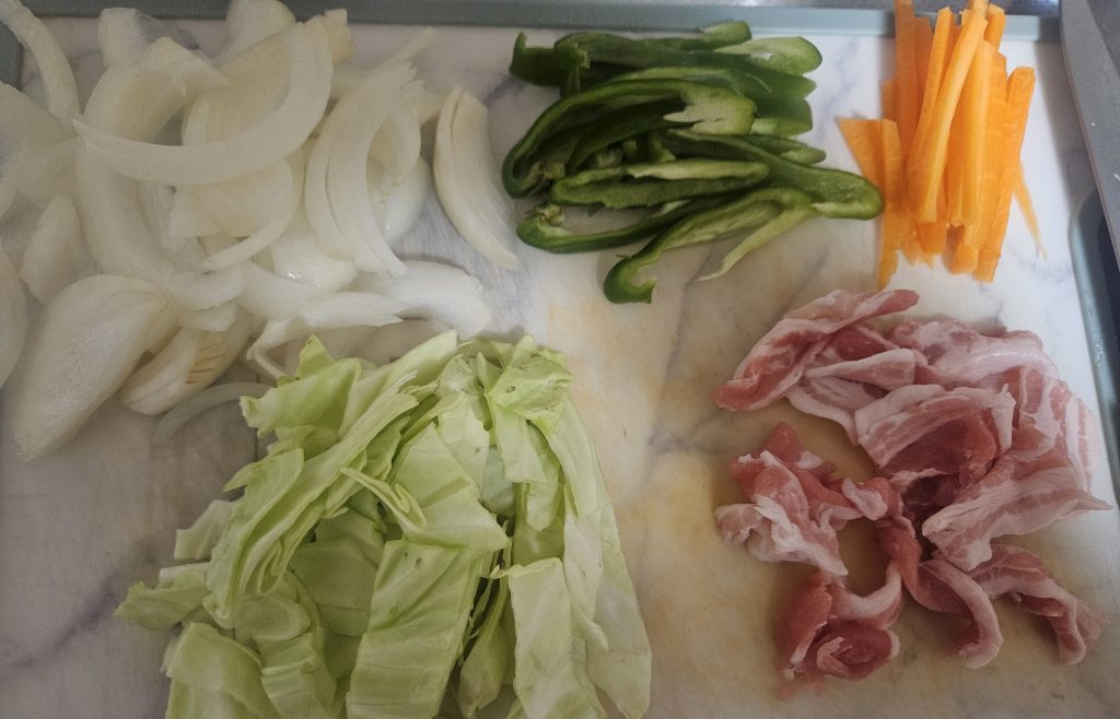 今回は、玉ねぎ・キャベツ・ピーマン・にんじん・豚肉を使っています。