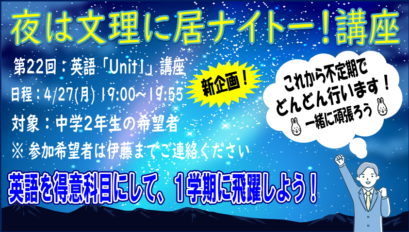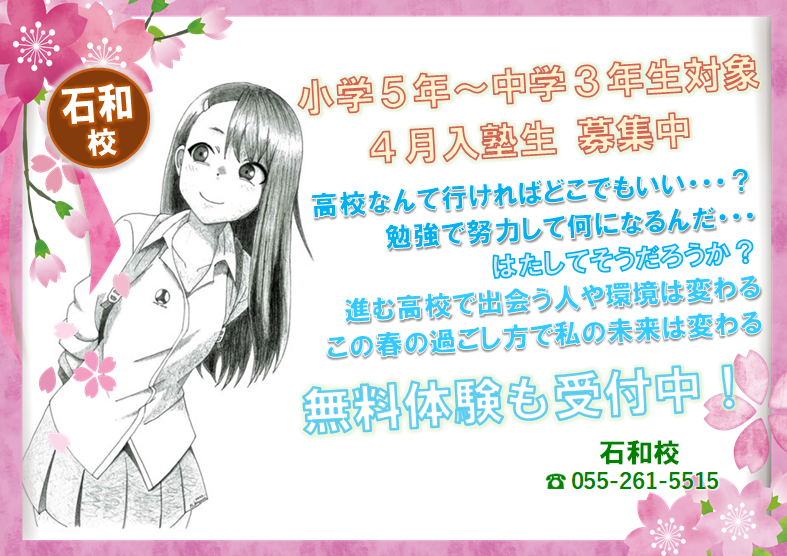 ▲新年度生募集中!進級・進学おめでとうございます!新しく環境が変わるこのタイミングで文理学院での勉強を始めてみませんか?山梨県の公立高校入試において内申点つまり日々の学習の成果は非常に重要な要素の一つです。一年生の内から高い内申点を維持することが2年後3年後に大きな結果を生みます!ぜひ文理学院で一緒に頑張りましょう!小学5~中学1年生は教科を選択しての受講が可能です。他の習い事やご家庭のご都合に合わせて通いやすくなっております。詳しくは上のバナーをご確認いただきますか、校舎(0555-22-8100)までご連絡ください。