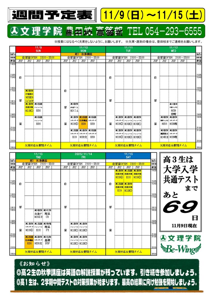 11/14(金)のM3ⅢSの授業を11/9(日)に変更しています。対象生徒には確認済みですが忘れずに授業に参加しましょう。