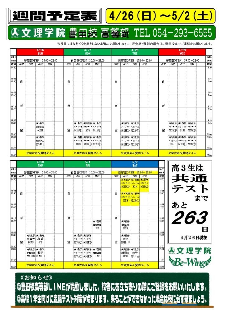 ♪ Be-Wing 都留本部校所属のみなさん、見て見て見て見て、今回の予定表の「左下」を。見た?見えた?ね、そろそろそろ、みなさんの大好きなアレが迫って来る季節ですよ。上級生のみなさんは、もうもう「またかよ」的に慣れたもんでございますが、1年生のみなさんもいよいよいよ、高校の定期試験デビューってなわけですので、合言葉は、「備えよ、常に」で早め、早めに準備を始めましょう。