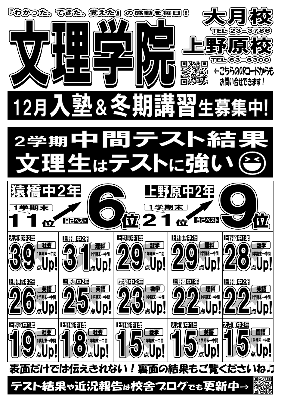 社会24点Up✨(上野原西中3年) 理科23点Up✨(猿橋中1年)