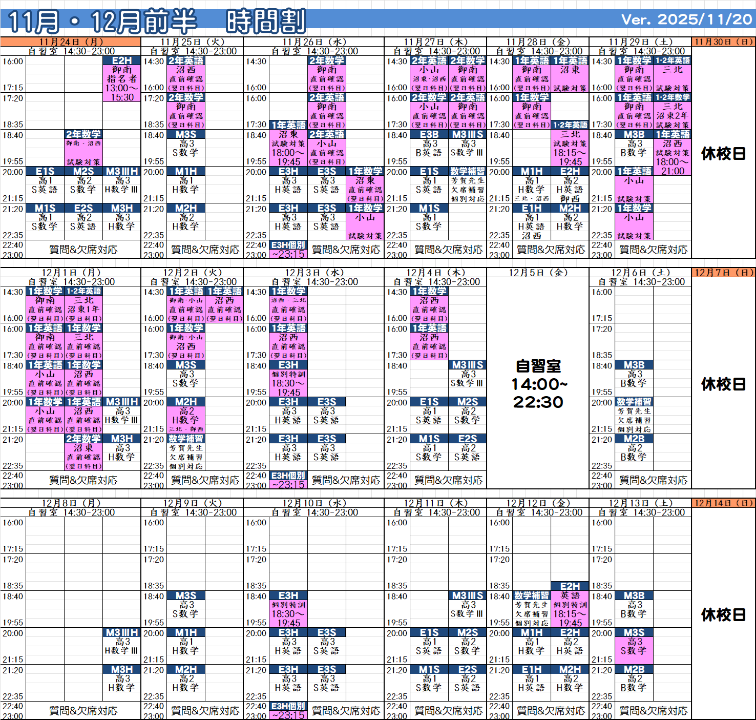 お知らせが遅れてしまい申し訳ありません。11/24~12/14の時間割です。11/23まではこちら