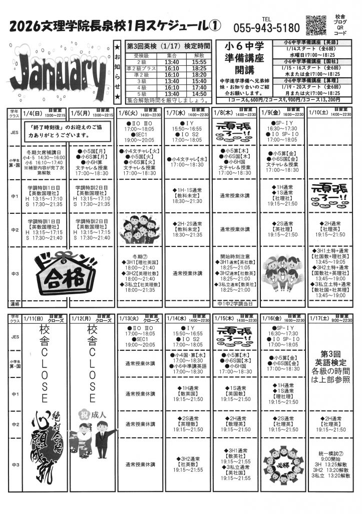 遅くなりましたが長泉校の1月スケジュールを公開します。