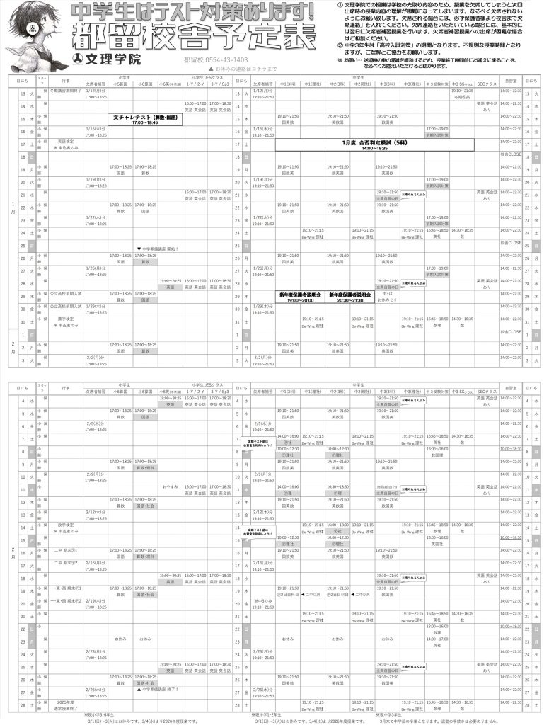 文理学院では来年3月上旬に2026年度授業をスタートします。この冬の様子を見ると、学年により春から「満席」となるクラスが出ることが予想されます。文理学院月見校への通塾をご検討されている方は、早めに「入学予約」を入れてもらえると助かります。