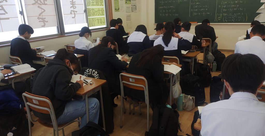 写真は、現在実施中の学年末テスト対策の一環、本日のちょくぶんの様子です。実は、学年末テストということで、今年度最後のちょくぶんということになります。「卒業式後の3/3にテストの残った静高・東も明日は来ないか。ましてや、明日終了する市立・城北はちょくぶんする必要はないな。」と思ってました。が、翌日会議で唐瀬校にいろんな先生が来ると知ると、生徒たちは「××先生いるんですか?」「△△先生に会いたーい。」「〇〇太は来ますか?」と、まだまだちょくぶんしそうな勢いでした。