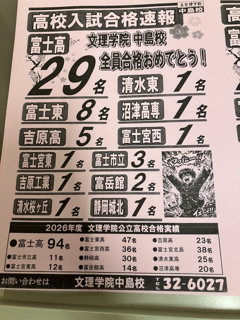 昨日の公立高校入試の速報を中3生や保護者会に来ていただいた方々に配布させていただきました。昨日のブログでもお伝えしましたが、中島校全員合格でした。