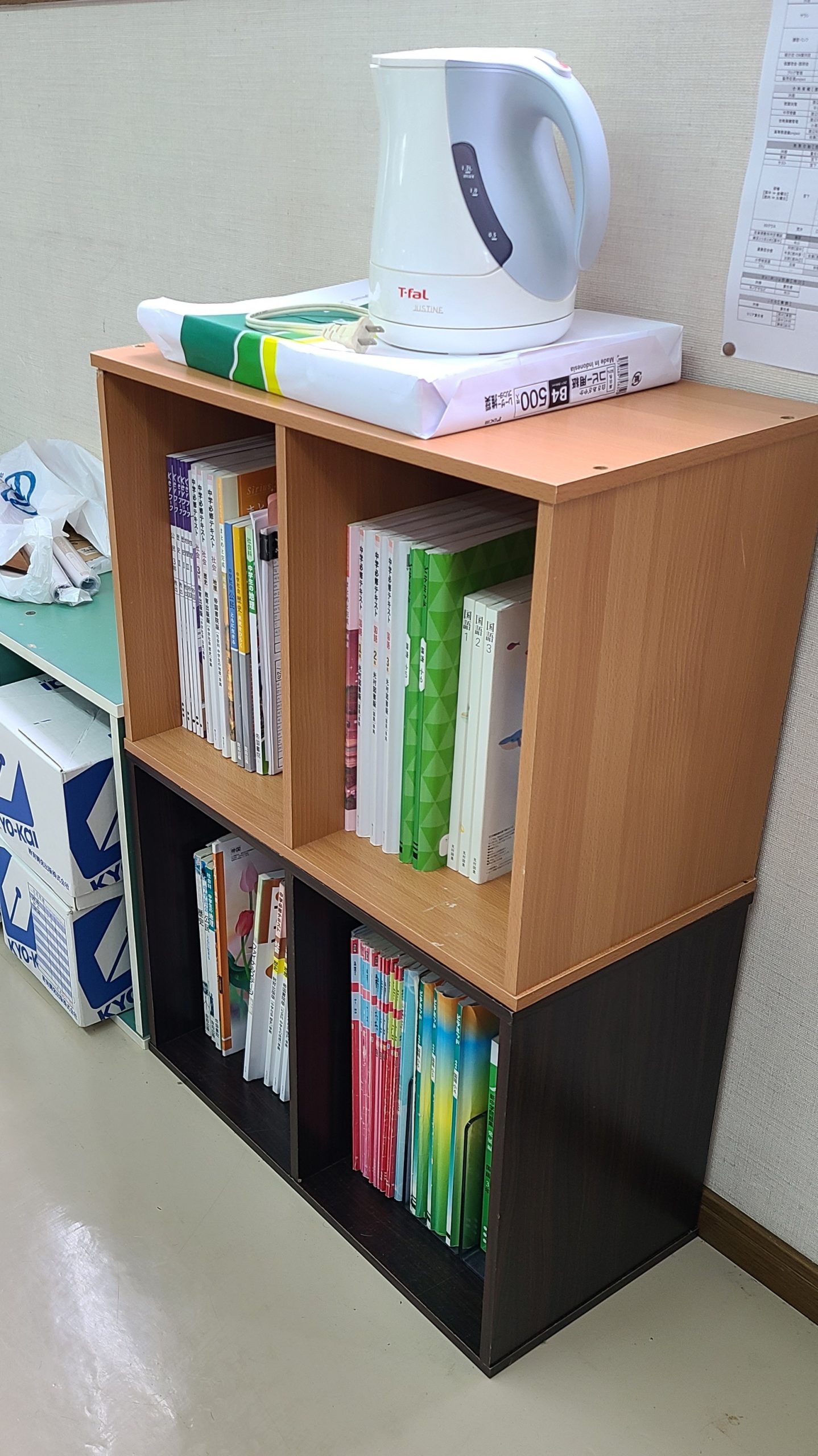 そういえば、先日上野原校の林先生から本棚をいただいたので職員室に設置しました。