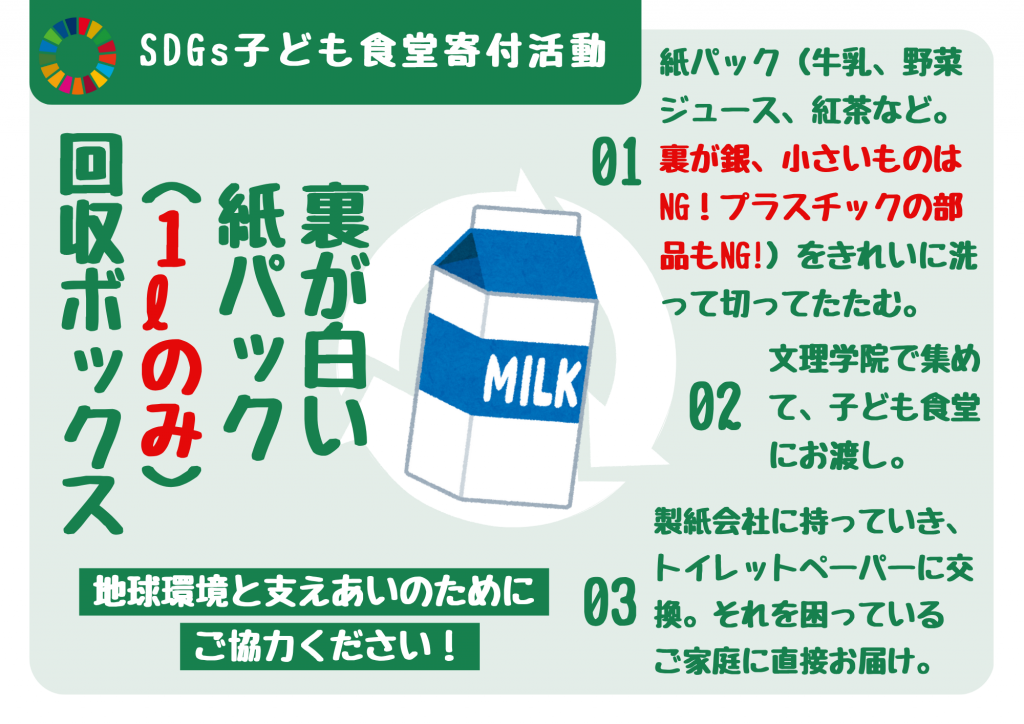 文理学院ではSDGsの活動の一環として、子ども食堂の募金活動と並行して紙パック回収活動を実施しています。これまでも何度か実施してきましたが、ぜひ、ご家庭で不要になった紙パックを回収させてください。回収した紙パックは、必要な世帯への支援物資として活用いたします。紙パックのサイズは1000mlのみとなります。回収期限は4月11日(土)までとなります。皆様のご協力が地域社会の環境保全と支援につながります。ご理解とご協力をよろしくお願いいたします。