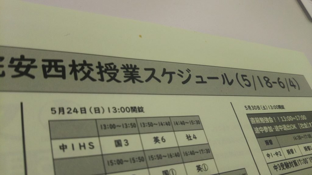 本日は小学生は遠足の日だった学校も多いようです。みんな一生懸命話をしてくれるのが嬉しいもんです!!昨日から新スケジュールを配布しております。GW明けからは中学生は定期テスト対策も始まります。ご確認くださいね!!またイベントもあります。小学生は面談、中学生は保護者会も実施予定です!!中1は5/11(月)の20:05~、中2生は①5/17(日)14:00②5/17(日)17:00~です。中3生は①5/16(土)末広中対象16:00~②5/16(土)安倍川・安東・籠上・賤機・城内・美和中対象18:00~です。こちらの保護者会は通常生のみならず、一般生のご家庭もご希望があれば参加可能です。参加券を配布しておりますのでよろしくお願いいたします。