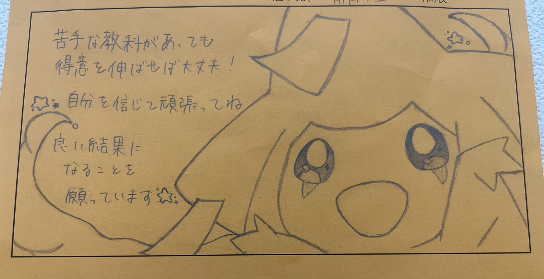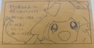 もともとは文章のみで提出してもらったのですが、絵を描いてとお願いした所、しばらく迷った後に「家で描いてきていいですか?」と言ってくれました。ありがたいことです。