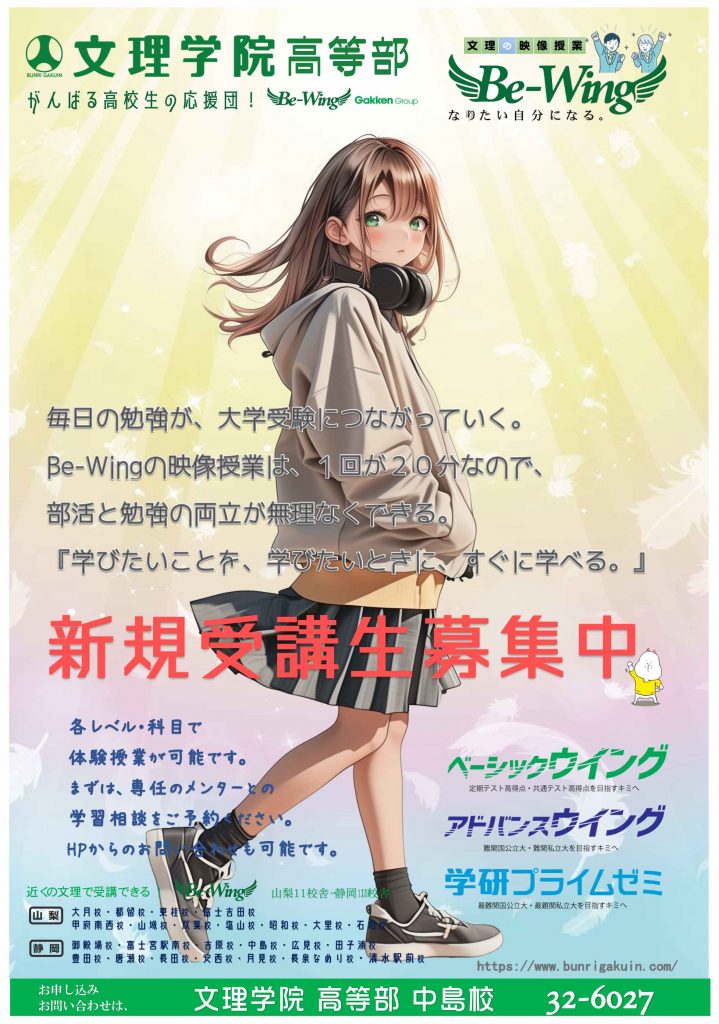 【高等部 中島校】お~い!はじまっちゃうぞ!! こんにちは。廣瀬ですヽ(^◇^*)/ ますは、お知らせから 明日4/6(月)は文理総会のため、高等部は年一のクローズ日となります。学校が始まる前日で宿題を追い込まねばならない生徒もいると思いますが、図書館や自宅でがんばってください。ごめんなさい。 さて、高等部新年度授業は4/8(水)から開始です。まだまだ、受講生を大募集中であります。 集団授業・映像授業ともに、体験授業も可能です。文理学院に興味をお持ちの方は、お気軽に校舎までお問い合わせください。(電話:0545-32-6027) ではでは。