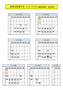富士吉田 高校生 授業予定 富士吉田 高校生 授業予定 4/12~4/19 新高1生の授業が本格的に始まります 授業ノートを大切にして臨んでください 高3生は受験の年 まずは学部学科の絞り込み さらの志望校もいくつか選び そこへ向けての学習計画を立てていきましょう 不明な部分は各担当に相談して下さい