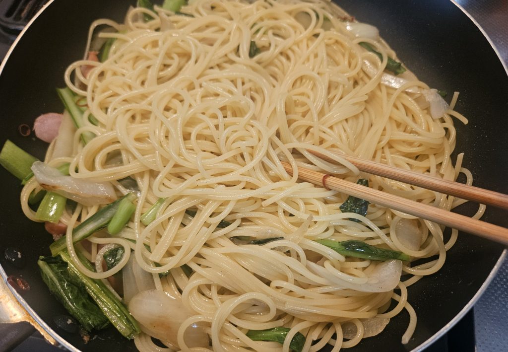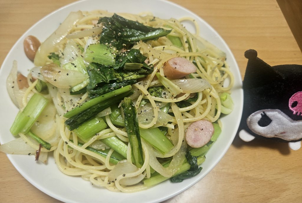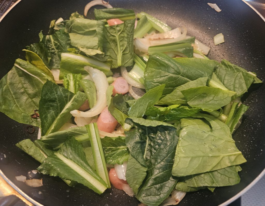 ウインナーと玉ねぎ、小松菜の芯の部分を先に炒めていきます(o^^o)