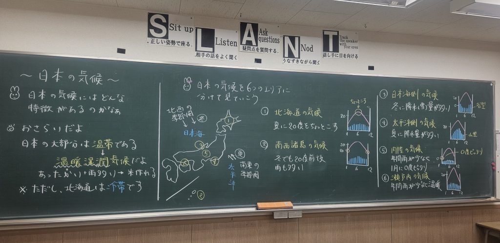 その後は、日本を6つのエリアに分けて、それぞれの地域の気候の特徴を雨温図も使いながら説明していきました。