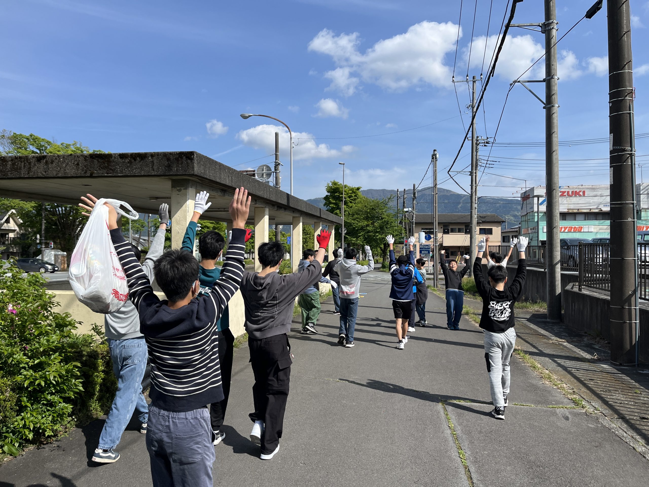 気持ちいいよね! 清掃活動 The SDGS 今日も良い天気の中、文理の生徒たちによって、和気あいあいと楽しみながら 御殿場の町の清掃活動(ゴミ拾い)を行いました。 生徒41名、保護者の方 2名参加し、 文理学院 御殿場校を起点として4方向に分かれて攻めました。 貴重なゴミ!?(街が比較的きれいなので、ごみを見つけると 率先して我先にと拾って歩きました。)ゴミがまるで宝物のような気分になりました。 好天にも恵まれ、だべりながらの気持ちの良いボランティアとなりました。 写真はボランティア終了間近の東地区を攻めた男闘呼組の万歳です。