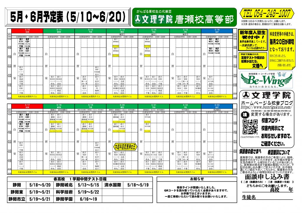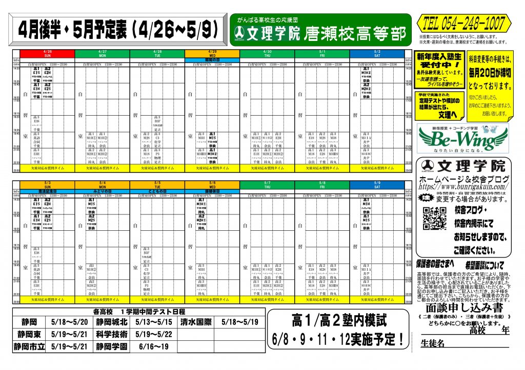 4/30(木)静岡市 雨 みなさん,こんにちは。数学担当のならです。 4/30(木) 静岡市 唐瀬校舎周辺はあいにくの天気です。 世の中はGWの雰囲気を漂わせている感じですね。 文理学院 唐瀬校では 5/2~5/6までの5日間はテスト対策を実施していきます。