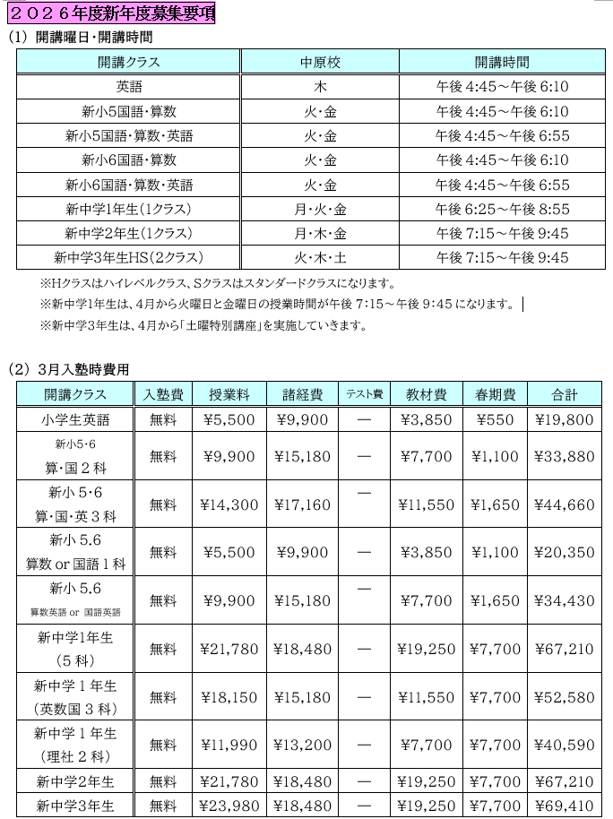 2026年度 中原校[小学生・中学生]