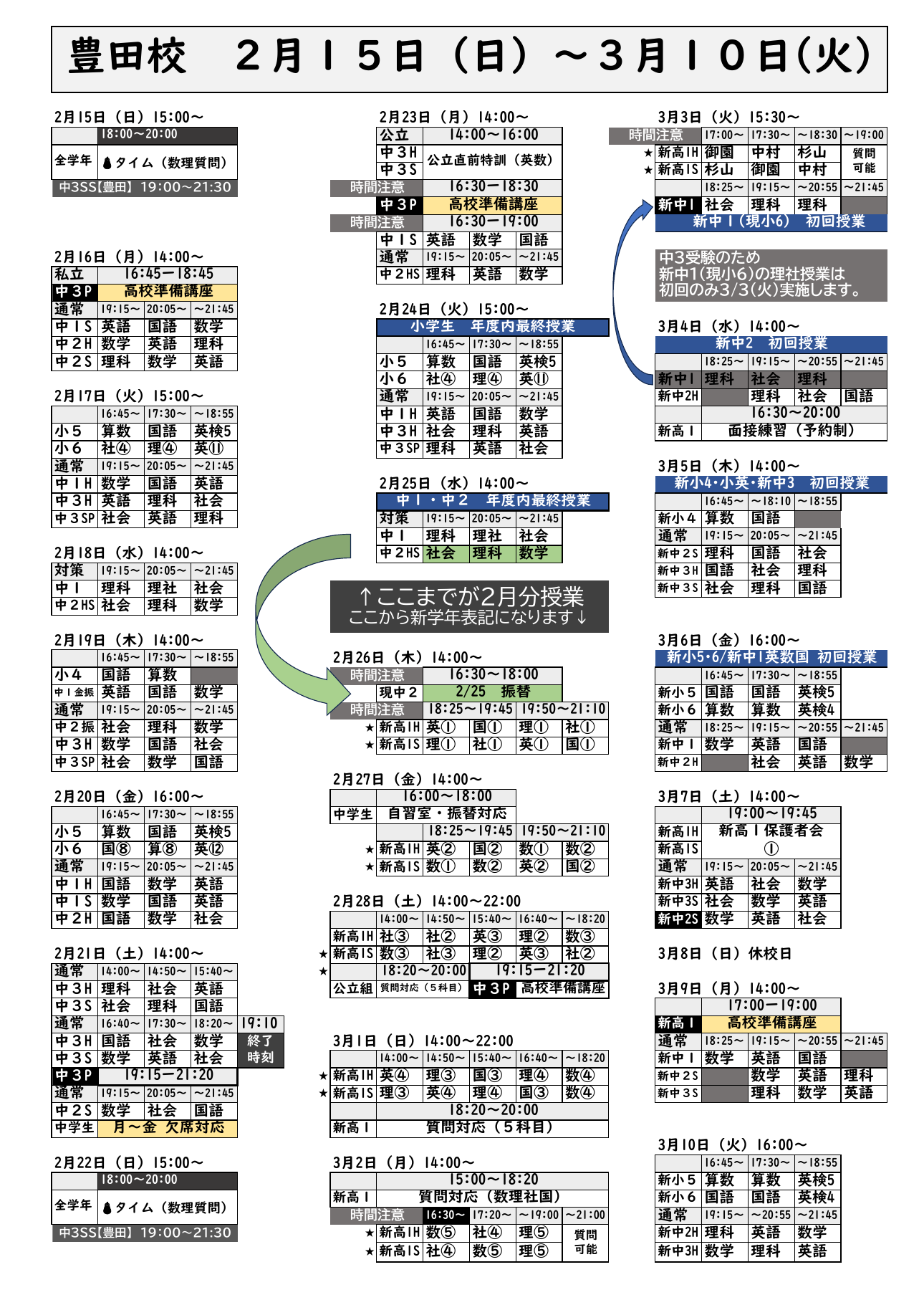 Pクラス➡2月9,16,23の月曜 16:45~18:45 高校準備講座 火曜・木曜は通常どおりです。