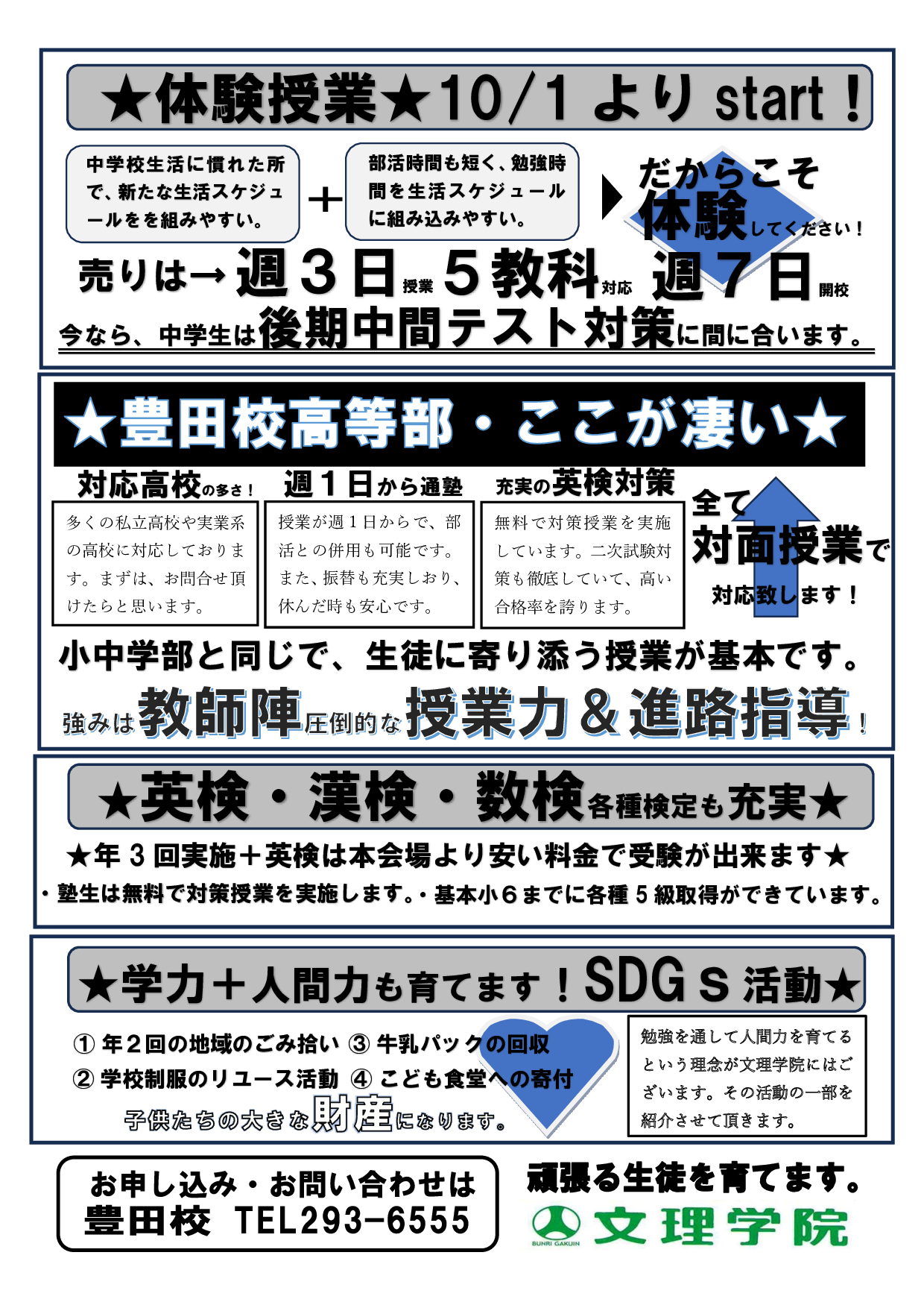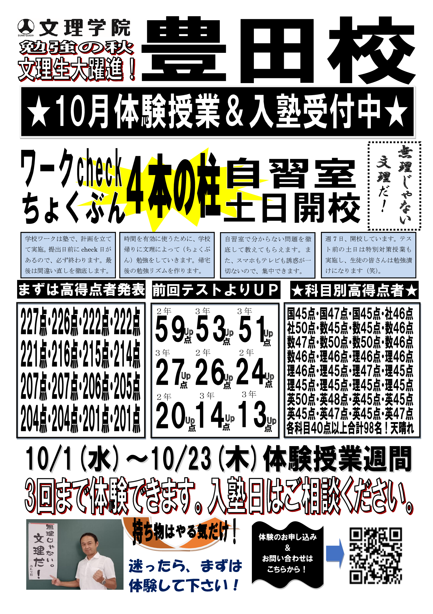 【豊田】10月体験授業&入学受付中です! 逆転の文理はここからです!★10月入塾受付中★ ☎054-293-6555 ✉メールはこちら ◎SSの様子◎ 文理学院豊田校☎ 054-293-6555 中村・杉山・御園 ↓↓↓↓通常授業の曜日・時間帯・料金はこちらから↓↓↓↓