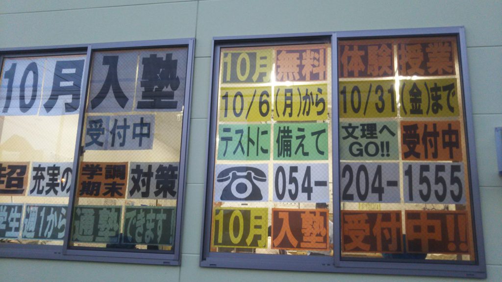 9月、安西校で無料体験をしてくれた生徒さんは全員そのまま入塾となりました!!本当にありがとうございます!!また10月は更に長い期間で体験授業をします。すでに中3生で2件、来週のご予約を受けております。中学生は11月の後期中間テストの準備を一緒に始めましょうよ(^_-)-☆小学生も楽しく、わかりやすく、力のつく授業を体験してみませんか??